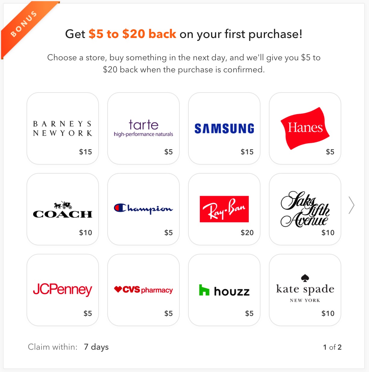 Honey Gold 对于新用户还有一个 Bonus,对于某些商家,消费第一单后,可以获得 $5 – $20 不等的奖励。如下图所示,比如在 RayBan 消费后,可以获得 $20 的额外奖励: