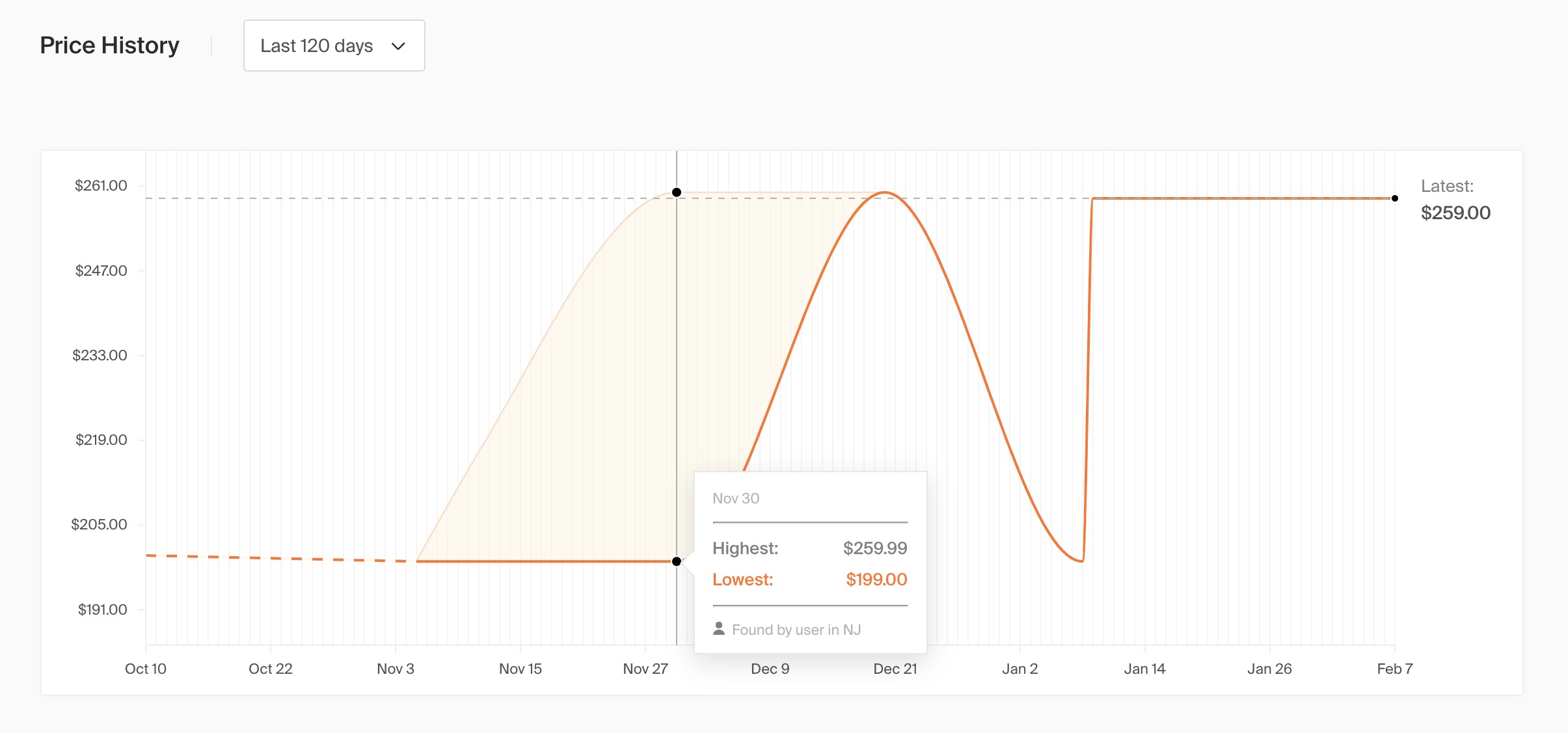 下图是这款商品的价格历史曲线,可以选择最多 120 天的记录。可以看到之前的最低价是 $199,而现在价格 $259.99,其实不是入手的好时候。