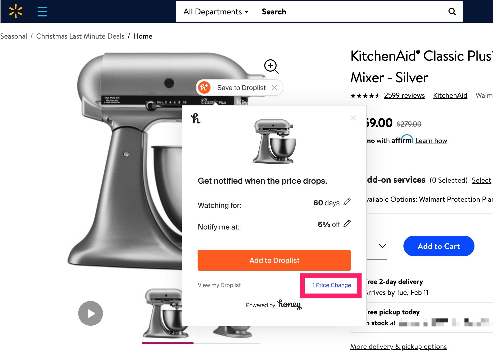 Honey 可以帮你监控某个商品的价格,当价格变化符合条件时就发邮件通知你。这个服务叫做 Droplist。