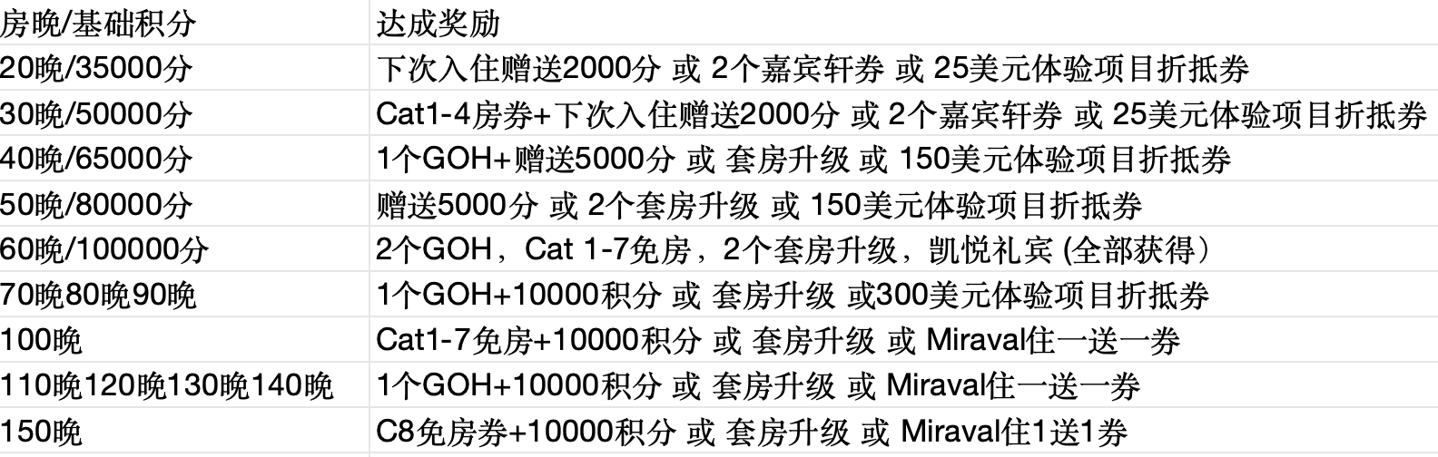 增加了新的奖励种类(下次入住赠2000分,GOH权益,Cat1-8免房券(150晚专属))