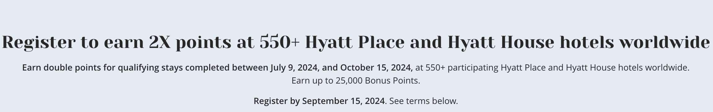【2024.7更新】9月15日前注册活动,10月15日前入住Hyatt House和Hyatt Place这两个品牌,可得双倍积分,最多可获得25K积分(注:已有的预定不需要重新订,入住前注册活动即可)
