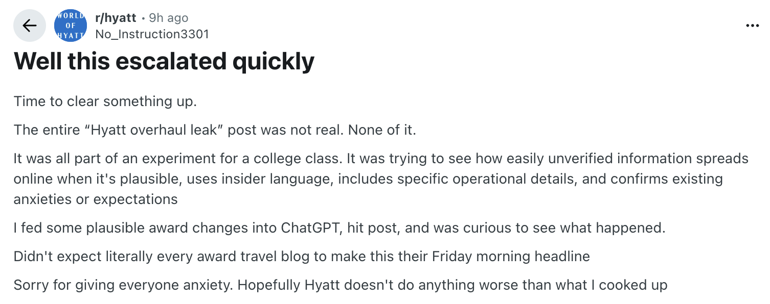 【2026.2更新2】某位Reddit用户在凯悦板块发布了一篇讯息,凯悦即将对常旅体系进行重要更新(假消息,AI生成的)细节如下: