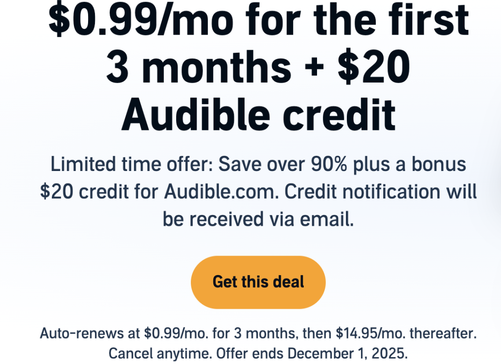 【2025.11 Audible Plus 3个月 $0.99/mo plus $20 credit】