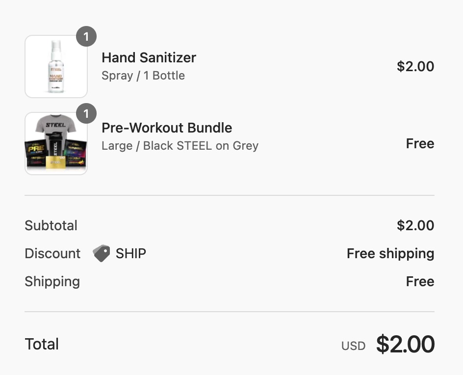 Steel 最新活动,仅需花费 $2 即可领取 Workout Bundle,包含 T-Shirt, Shaker Bottles, $20 Steel Gift Card, Pre-Workout Supplements, Hand Sanitizer 等,而且免邮费: