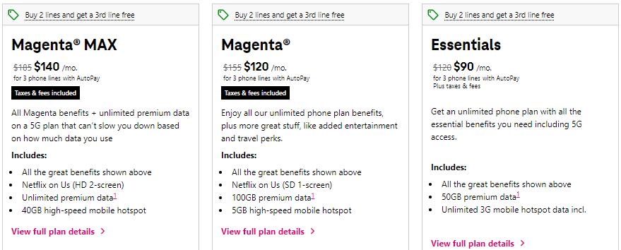 除此之外,Magenta视频会员福利,包括您还可以将 Netflix Basic会员,以及1年的Apple TV和Paramount+会员。不过,T-Mobile Magenta 比 Essentials 贵。单条线每月70美元(需要启用Auto Pay)或3条线总计120美元/月, 每天线合40美元/月。附加费和税费也已含。