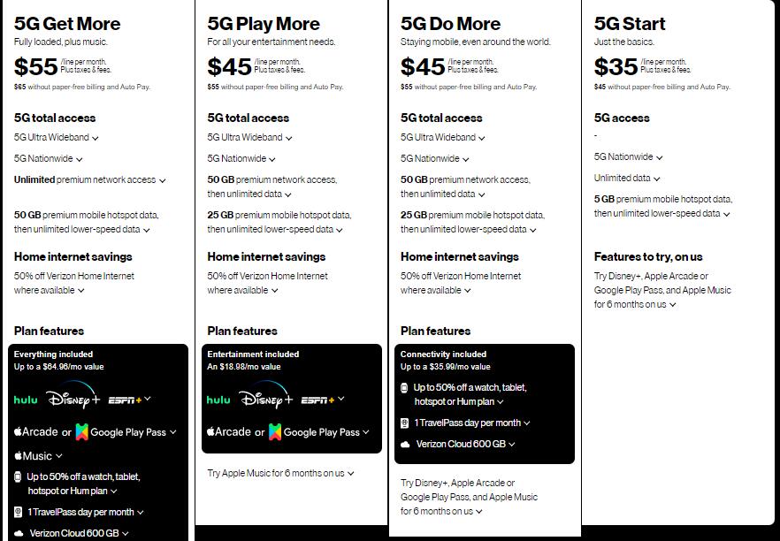 Verizon有4个无限流量套餐: