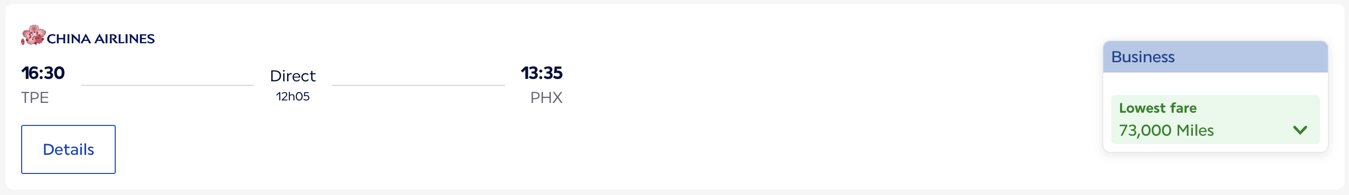 相信也是許多讀者有機會使用到的哩程計畫之一,尤其是兌換法國航空與荷蘭航空的航班,或是兌換同為天合聯盟夥伴的中華航空 (China Airlines) 的航班,都是非常適合的,而兌換所需哩程則是採用動態標準,通常單程「商務艙」哩程機位在80,000 miles以下的數字,是我會比較推薦讀者可以考慮的兌換標的。另外,除了兌換「美國~歐洲」的法國航空/荷蘭航空的航班,我知道許多讀者對於兌換中華航空的航班相當有興趣,例如「台北~鳳凰城」航線,單程商務艙只要73,000 miles,算是相當不錯的標準!
