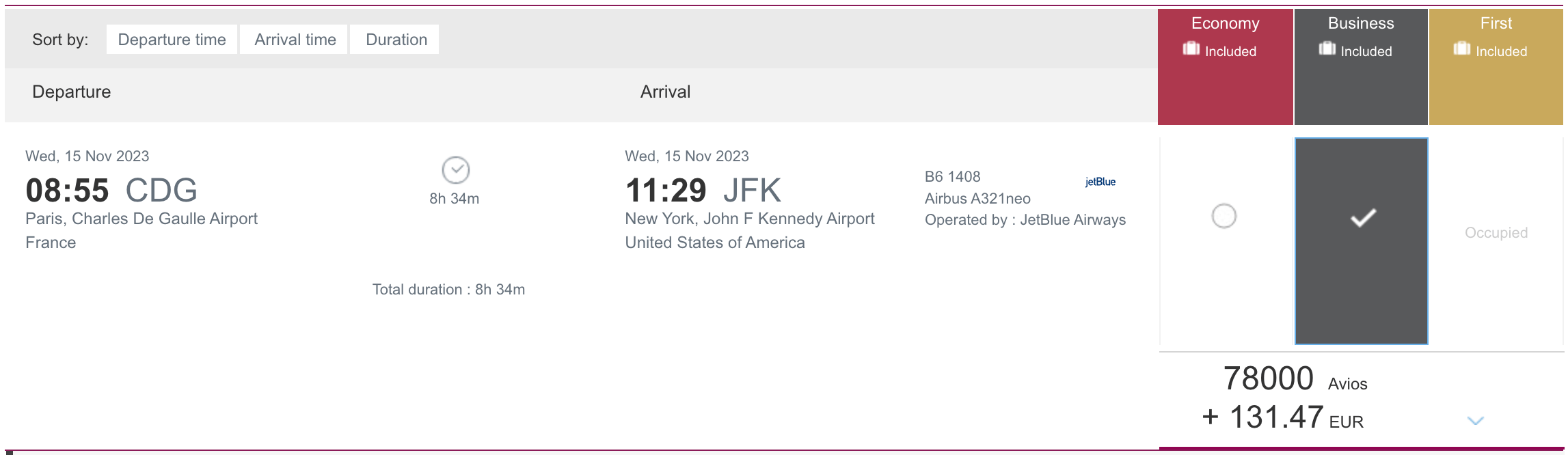 而針對美國的捷藍航空 (JetBlue),卡達航空則有另一個獨立的兌換標準,以跨大西洋的「巴黎~紐約」航線的「Mint Class」商務艙為例,「單程」商務艙機票所需哩程為78,000 Avios(可線上兌換):