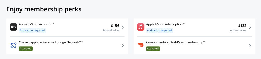 Chase Sapphire Reserve 全面更新的福利已经对于所有卡(不管新卡还是老卡)都已经生效了!大部分福利都不需要手动激活,但是Stubhub Credit的福利需要手动激活,大家记得去Chase的网站Benefits页面激活一下。然后Apple TV+/Music的福利也需要手动去Apple注册,记得设置用CSR的卡付费。
