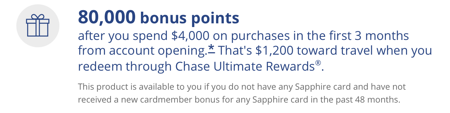 - 如果满足下列条件之一,你将无法获得开卡奖励并且申请会被秒拒:(1)正在持有任何 Sapphire 系列信用卡;(2)48个月内获得过任何 Sapphire 系列信用卡的开卡奖励。注意是从拿到开卡奖励的时刻开始算,不是开卡时刻也不是关卡时刻。