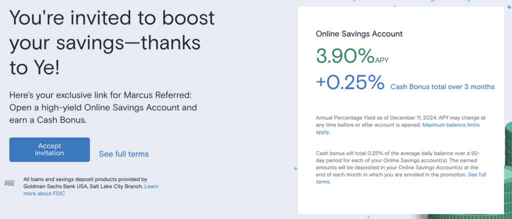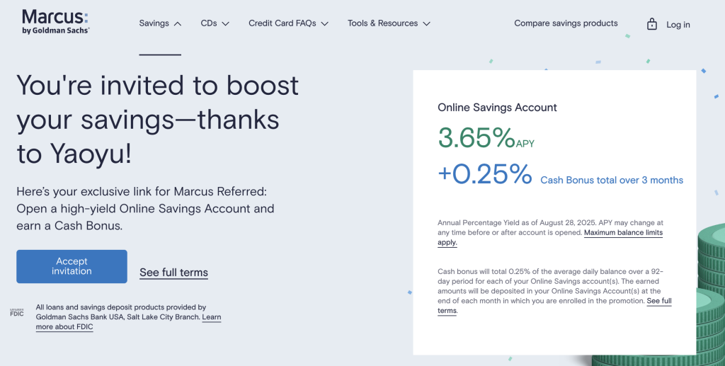 现在Marcus有最高三个月4.9%的储蓄利息,通过推荐链接申请可以获取三个月的额外 0.25%的bonus (基本就是1% APY),base的3.65% 加上1%就是 4.65% APY 了。三个月4.9%在美联储利率下行的大环境下是很不错的利息啦!