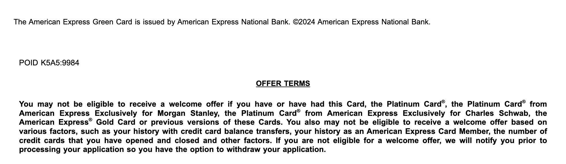 【2024.2更新】如果你曾经获得过白金卡,其他版本白金卡(Morgan Stanley,Goldman Sachs,Charles Schwab)或金卡的开卡奖励,那么你将无法获得绿卡的开卡奖励