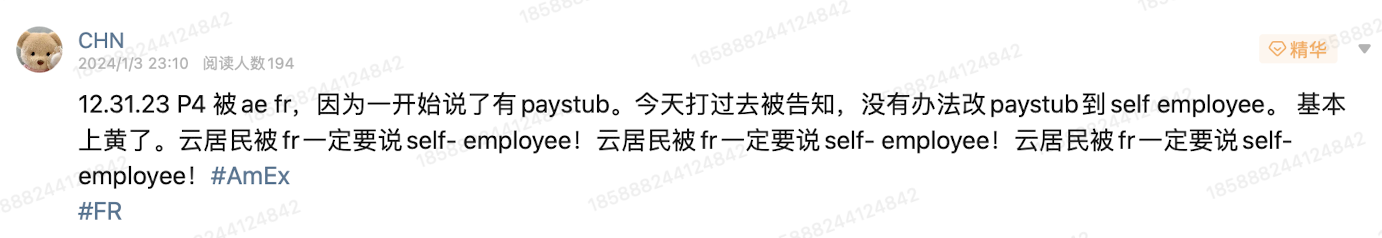 除此之外,星球、Discord以及微信群里还有几个类似DP(但经过了FR再杀),都是Amex FR专员咨询BP来源,并让提供相关材料,如果无法提供,即使你提交了4506-C,等待你的也是关账户。总结就是,专员如果问是否有bp来源信息,如果你给不了,大概率这个账户没了,有收入有税表也救不了你。