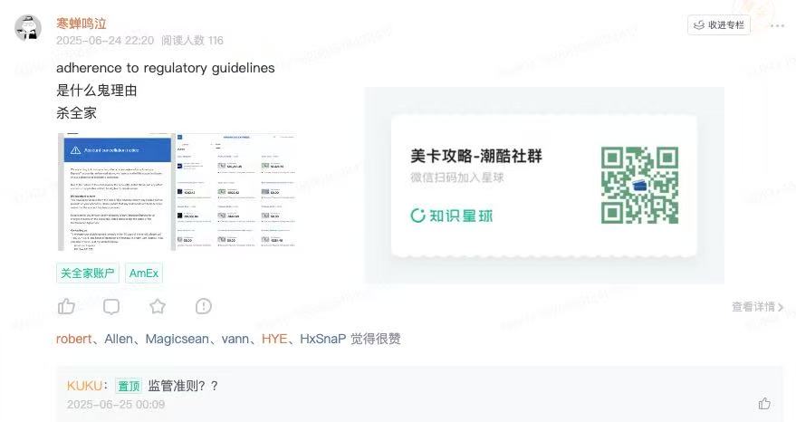 【2025.6更新】出现新型关全家账户原因,因为监管规则:adherence to regulatory guidelines(可能跟消费类型有关)。HT:「美卡攻略-潮酷社群」知识星球