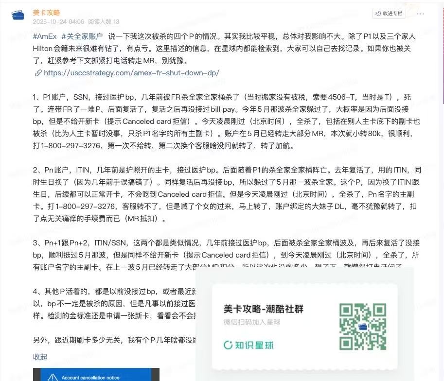 【2025.5更新】Amex消停了一周后,今天,把前面有关过账户的,其余Amex账户也全部杀完了,真的“杀全家”了,转分事宜请参考👆上面介绍。可以考虑开发家人来开卡了,比如国内的家人,通过ITIN+护照,还是可以开出很多美国信用卡的,具体参考「美卡攻略-潮酷社群」知识星球