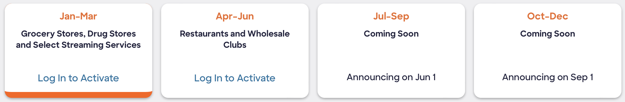 有几张信用卡有季度轮转5%的返现类别:Chase Freedom Flex (CFF)(以及旧版 Chase Freedom)、Discover It、Citi Dividend、US Bank Cash Plus。5%类别需要每季度激活才可以使用,以下为激活链接: