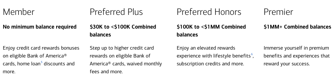 從5/27/2026當天開始,原本的「Preferred Rewards」獎勵計劃,將會改名為「BoA Rewards」,以下是在美國銀行帳戶內的資產,超過一定的價值時,可以獲得以下的等級,如下所示: