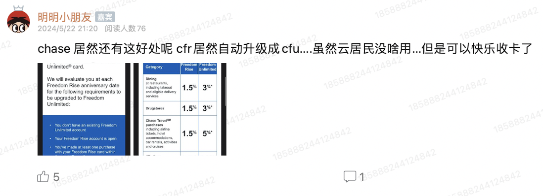 【2024.5更新】持有此卡一年后,银行会自动审查以下条件:持卡人的“Freedom Rise”账户保持开通状态,在过去12个月内有一笔消费,按时支付款项,没有freedom unlimited卡。如符合上述要求,那么此卡将升级为CFU,HT:「美卡攻略-潮酷社群」知识星球