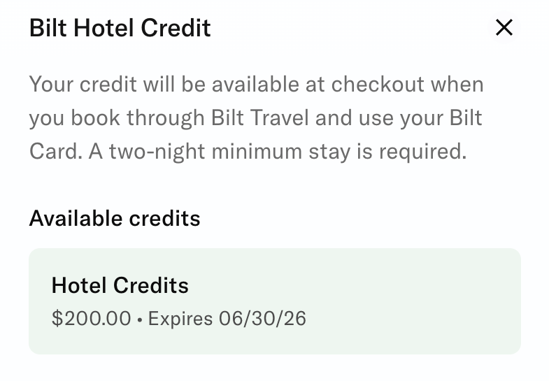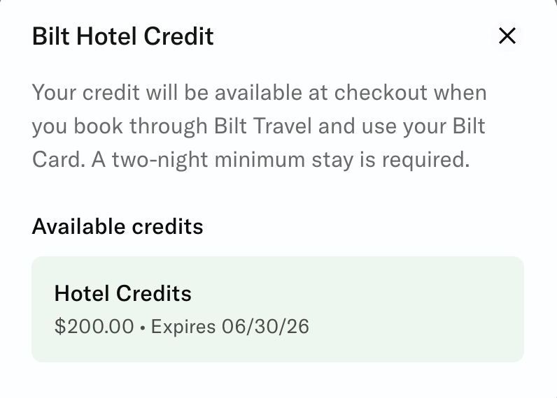 這張「Palladium」信用卡(點我)的另一個持卡福利,就是每日曆年 (Calendar Year) 內可獲得$400美金「Bilt Rewards旅遊傳送門網站」的酒店預訂消費退額,以每半年$200美金的方式給予。不過請特別注意,必須至少一次預訂兩晚的酒店住宿,算是一個美中不足的地方,但若能夠使用掉的話,也算是可以省下一些費用的。