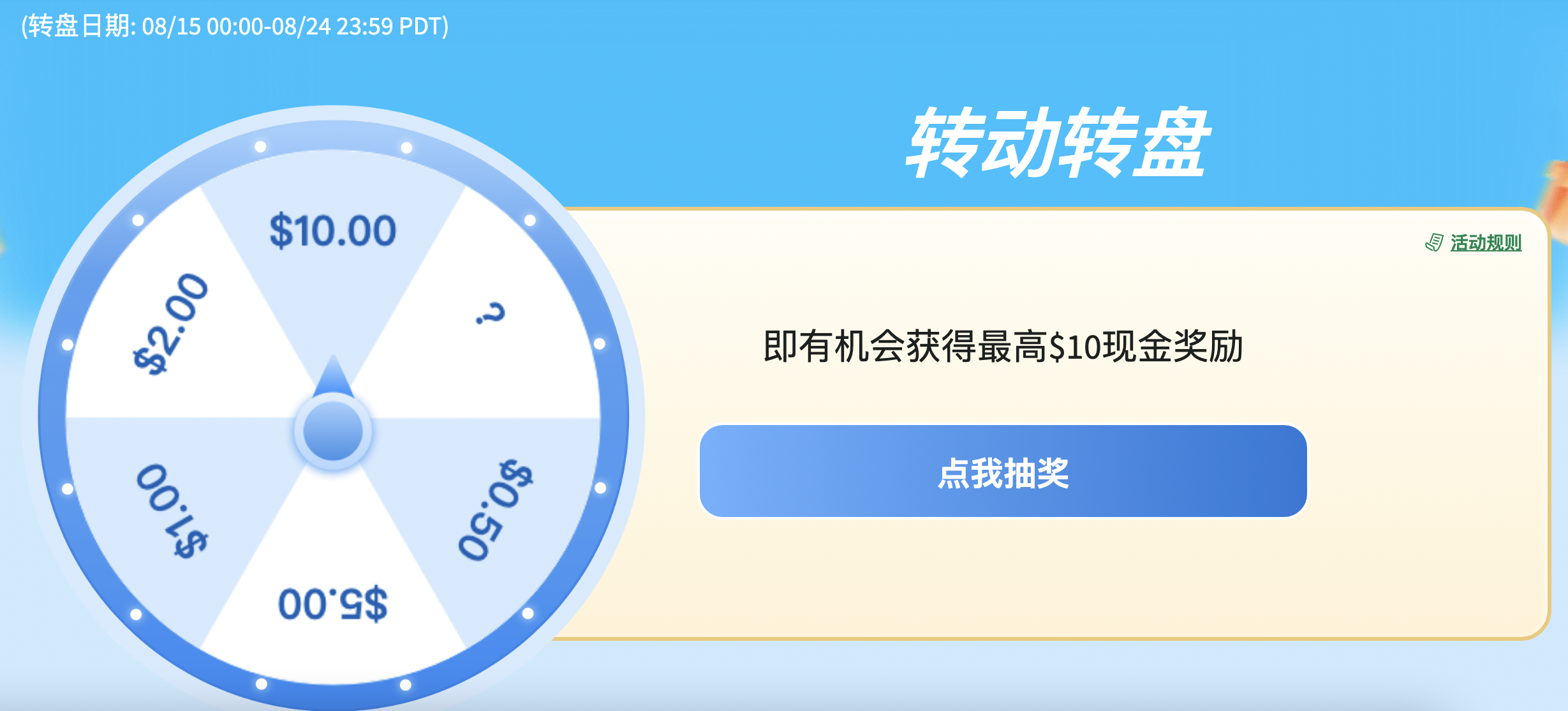 转盘活动(奖励累计3万美元,活动将在太平洋时间8月24日11点59分后结束)