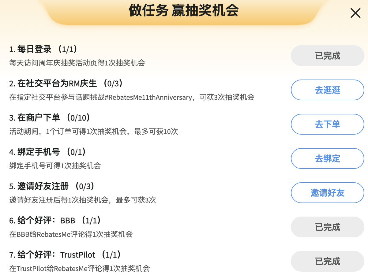 【2024.8更新】11周年庆活动,新用户注册奖励增加到$40(返利超过 $10 才能提取),还有转盘抽奖活动,完成指定任务即可增加抽奖次数,奖品包括现金返现和返现券