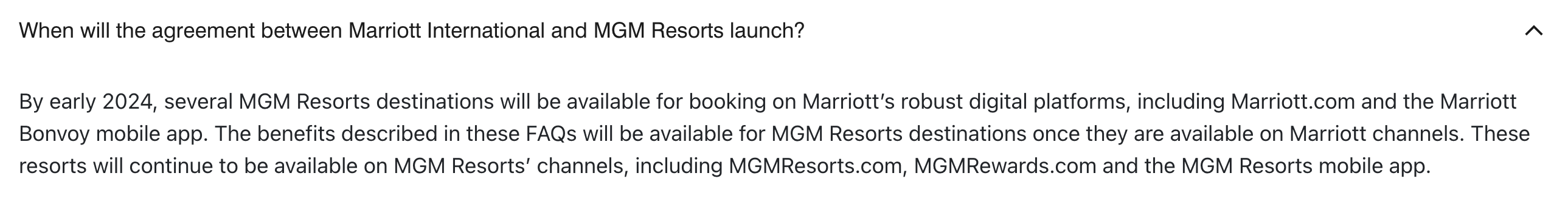【2023.10 更新】原本按计划这个月万豪和MGM这个合作就要正式开始的,但是一直没动静。今天双方官网都有了更新(比如万豪相关FAQ页面),新的预计开启时间推迟到2024年初了。