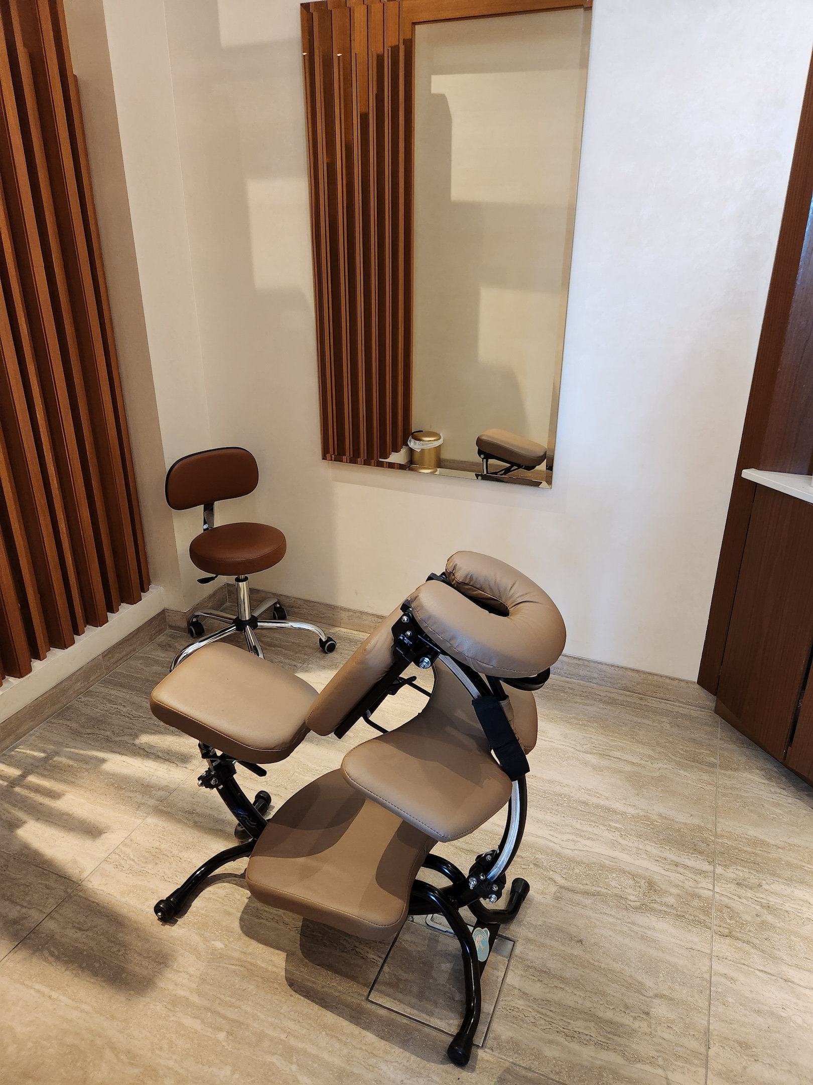 阿聯酋航空在頭等艙貴賓室,提供了相關的按摩/芳療服務(在名為「Timeless Spa」的場所內服務)。只要是搭乘阿聯酋航空頭等艙,都可以在這裡享有15分鐘的免費按摩喔!我曾經體驗過兩次,個人覺得師傅的力道大小適中,讓人真的是按了就不想結束啊!只能說短短的15分鐘,真的讓人意猶未盡(體驗文點我)。當然這裡除了免費提供的按摩服務以外,也可以使用付費的服務,像是剪頭髮,做指甲,以及全身按摩等等。