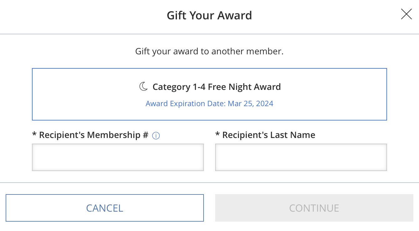 凯悦刚刚给系统做了升级,以上可转让的 Award 类别可以直接在网上就 gift 出去了。只需要输入接收人的会员号以及姓,非常方便快捷。
