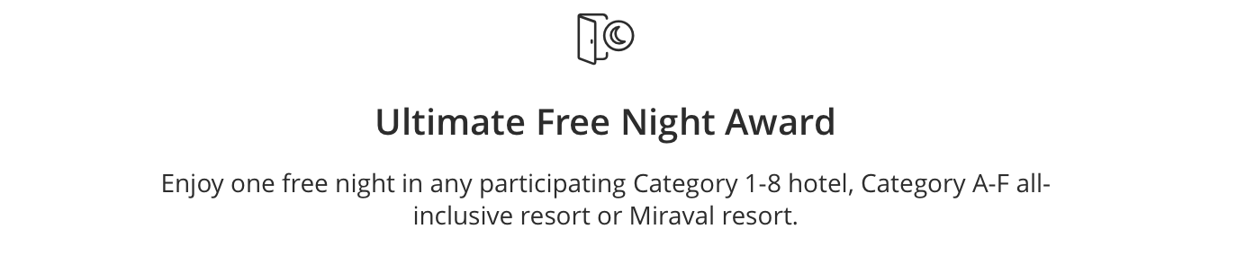 | 100晚 | Cat 1-7免房,以及 10000奖励积分/套房升级奖励/Miraval买一送一礼券 |