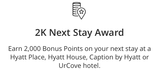 下次入住2000奖励积分,这个仅适用于入住 Hyatt Place, Hyatt House, Caption by Hyatt 或者 UrCove 这几个牌子。积分房或者FN也可以拿到额外2000分。有效期是180天。