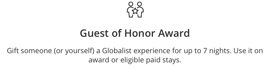 - 尊荣宾客奖励。这个奖励可以转赠给朋友,朋友可以在积分房或者现金房入住的时候在最多7天内获得环球客待遇。官方的说法是reimagined Guest of Honor award,应该是代表着替代了原来的尊荣宾客奖励。朋友完成入住后,送出 Guest of Honor Award的环球客会员也会收到1晚有效房晚。