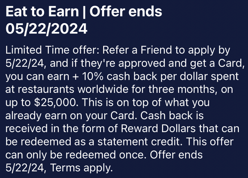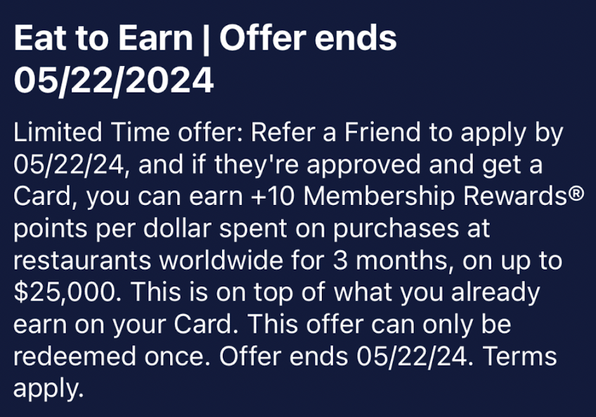 只要是通过Amex自家的个人或者商业MR卡、返现卡以及Delta联名卡的refer链接(Hilton联名信用卡不参与),都有这个福利,邀请人将在获得原来的refer奖励后,再获得全球餐饮消费额外10X 的奖励(或10%返现),限制前$25K(第一个refer被激活后的3个月内),需要在5月22日前完成refer。