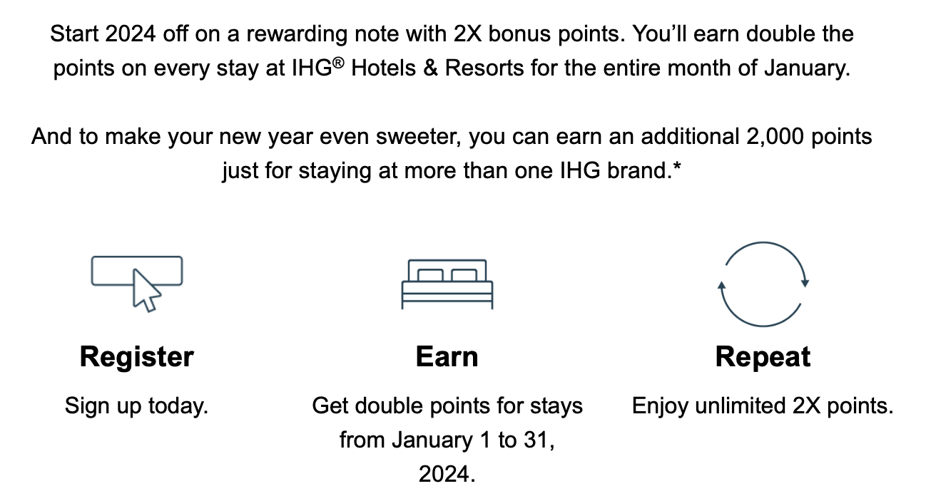 IHG Rewards 给2024开年第一个月搞了个单独的促销,现在已经开放注册了: