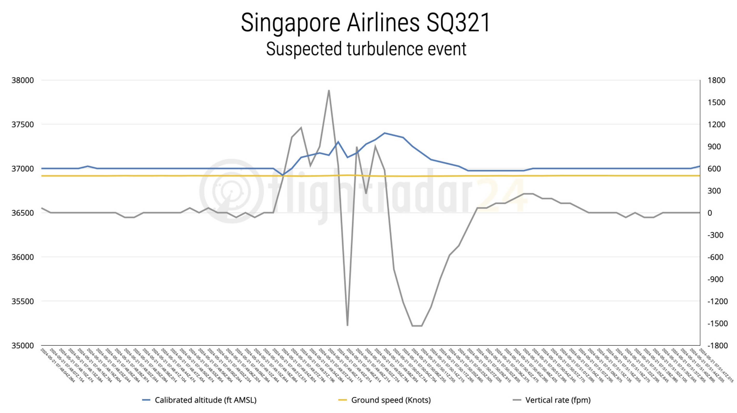 - 有新闻说飞机骤降6000英尺:这应该是SQ321的飞行员在遭遇颠簸后,主动申请并调整飞行高度避开颠簸区域,是完全正常的操作。根据下面来自FR24的图,遭遇颠簸时确实有很高的瞬时下降上升率,但飞机整体高度变化远没有 6000ft 这么夸张。