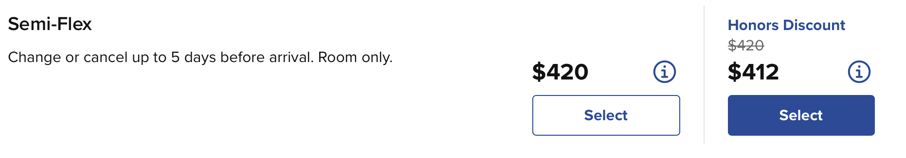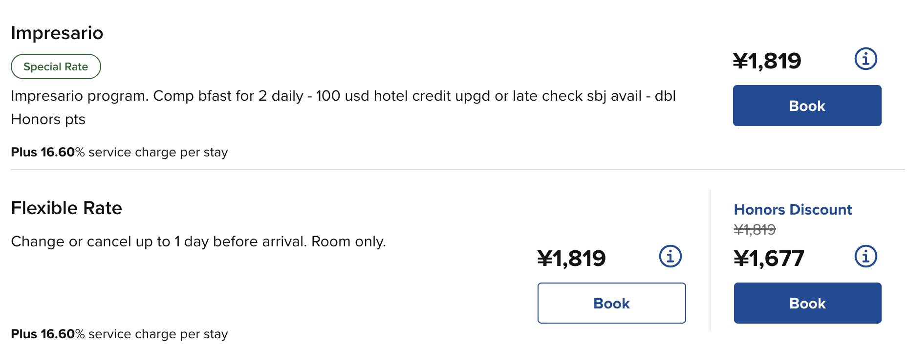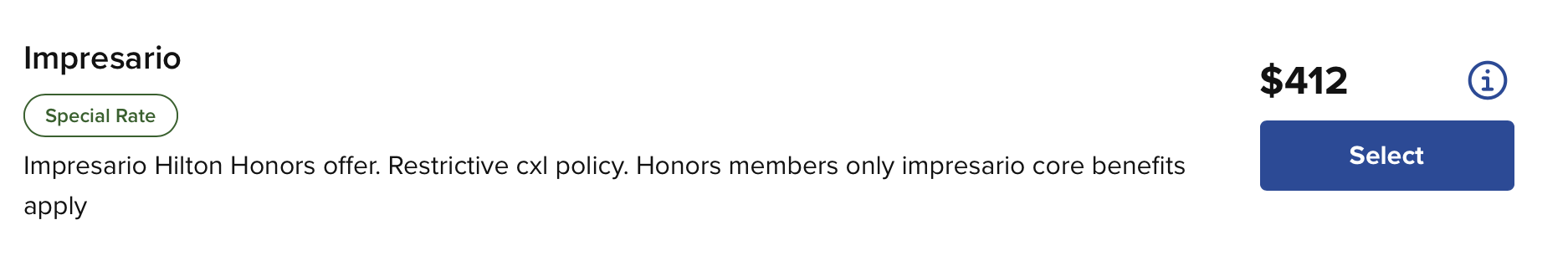 大部分情况下,Impresario 价格就是标准价,对应 Hilton 官网的 Flexible Rate(不是 Honors Discount 那个)。所以可以根据官网的 Flexible Rate 来推测 Impresario 价格。