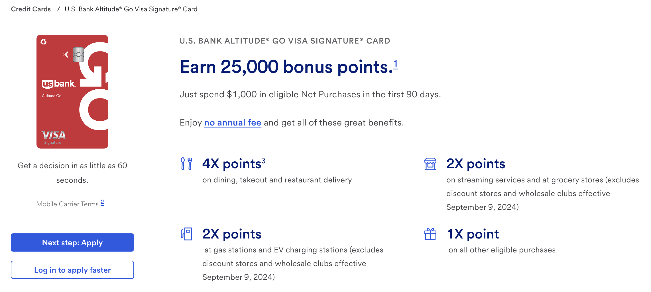 【2024.7更新】最新开卡奖励是25K积分($250),需要开卡90天内消费1000美元