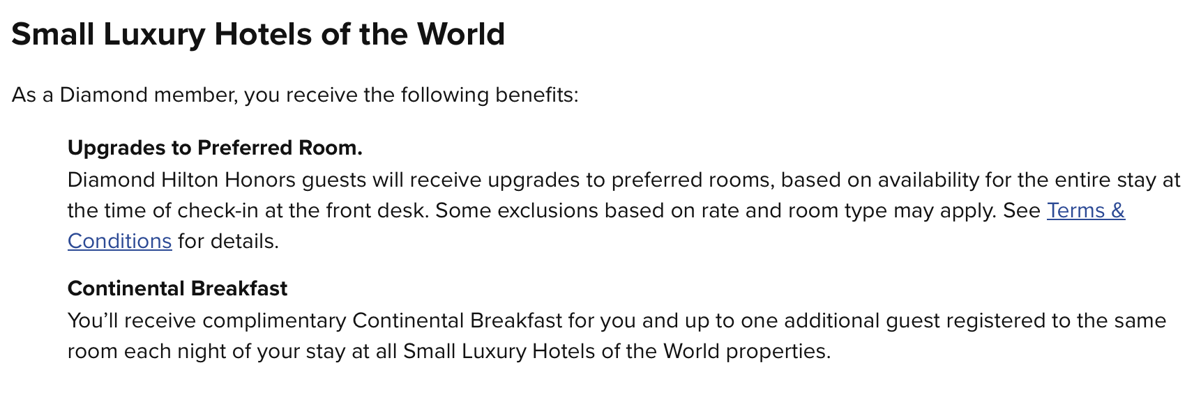 在 MyWay Benefits 中心也已经有会员福利介绍了,钻石会员有房型升级和免费双人欧陆早餐这两个福利。