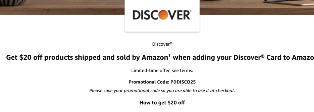 首次添加Discover信用卡优惠$20,需要使用code:PDDISCO25
