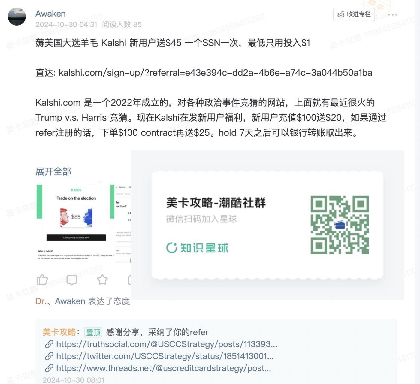 Kalshi.com 是一个 2022 年成立的,对各种政治事件竞猜的网站,上面就有最近很火的 Trump v.s. Harris 竞猜。现在 Kalshi 在发新用户福利,新用户充值 $100 送 $20,如果通过 refer 注册的话,下单 $100 contract 再送 $25.