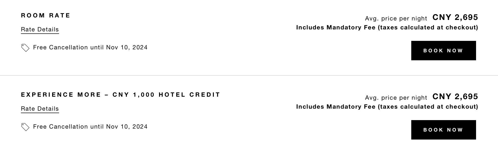- 住x付y:付y晚价格是按照官网标准价来的。例如一个酒店有住3付2,但是选择入住四晚,那么会按照3晚标准价来支付。如果一晚有其它折扣,这种时候比较划算的预定方式是 3+1 分开预定($100消费抵扣这种待遇只有一次)。