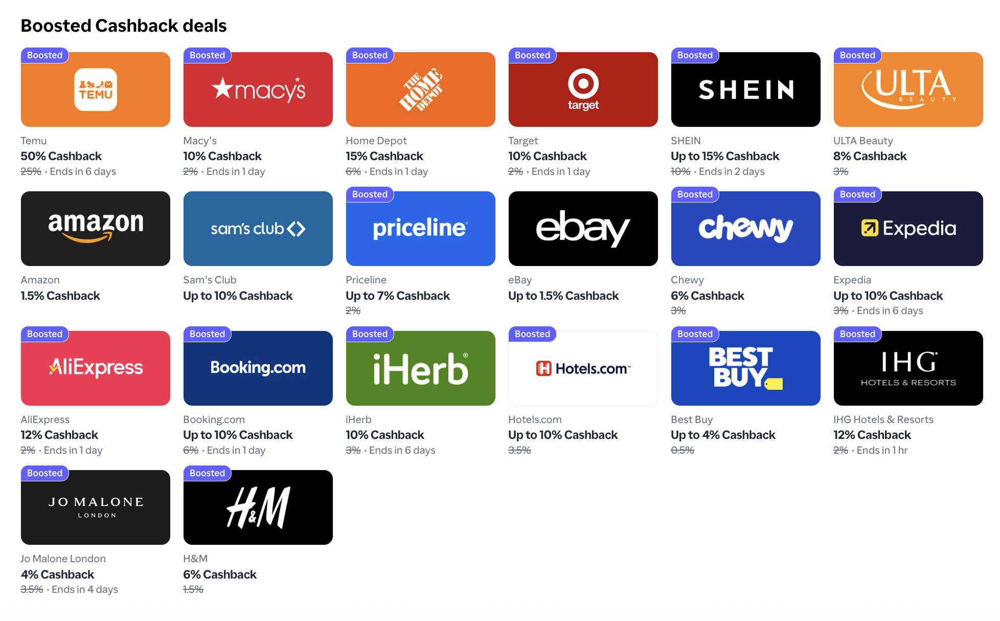 - 其中Amazon,Walmart,UberEats也有消费奖励,不定期会有高额返现