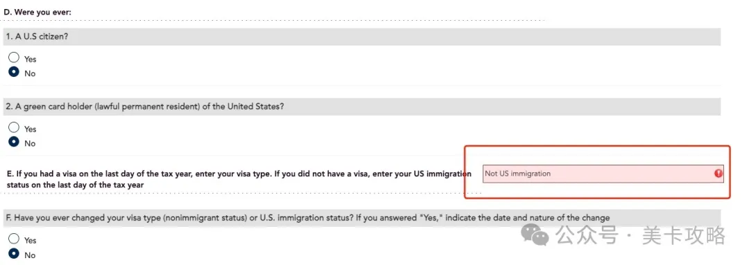 然后美国居住时间,是否去过加拿大、墨西哥这些,正常大家应该都没去过。签证跟移民情况,有签证就填写纳税年最后一天你的签证状态(比如你B1/B2还有效,就填入B1/B2),如果没有签证就填写移民状态(如图填入非美国移民即可)