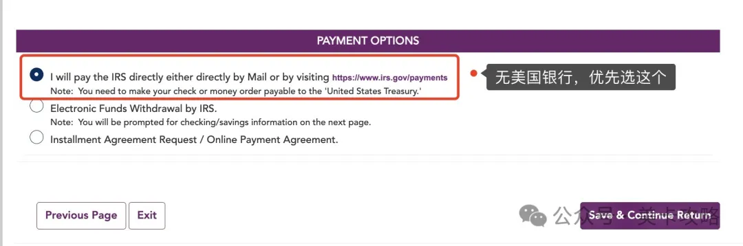 如果你没有任何美国银行账户,税款缴纳类型选第一个,mail 或 pay online(支持pay1040网站付款:https://www.pay1040.com/),可以用信用卡/借记卡支付,手续费1.75%(很划算)。
