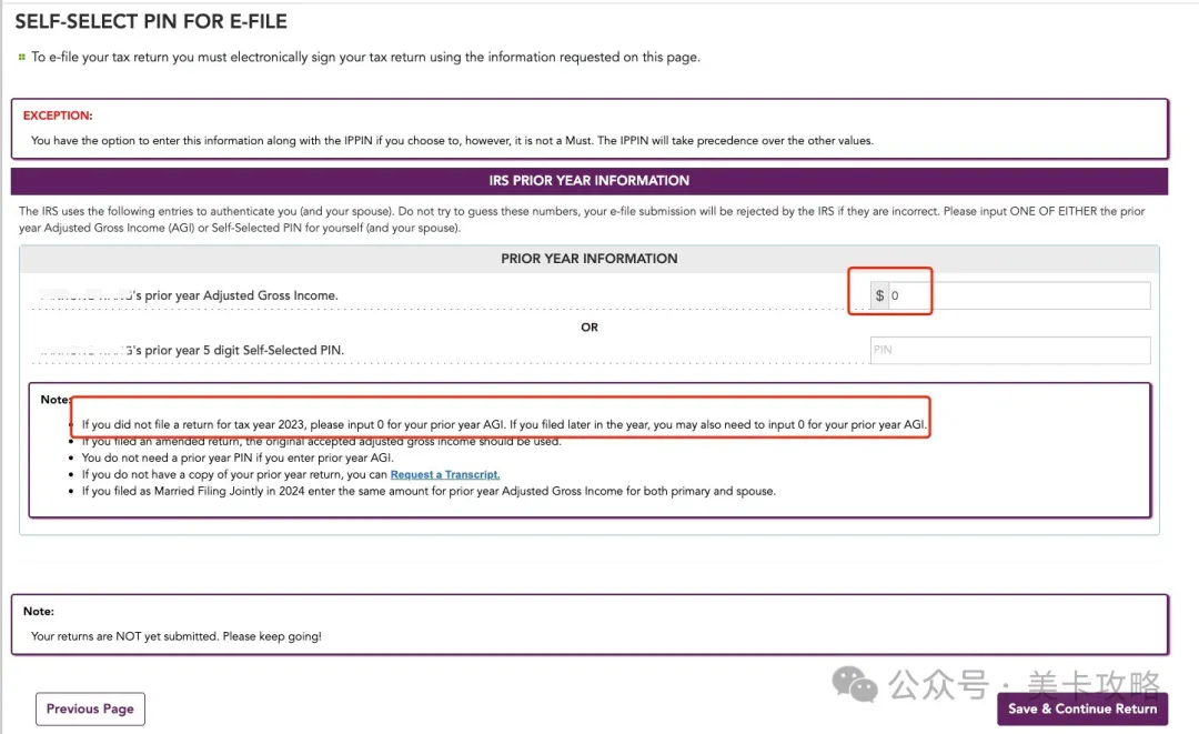 接下来确认下去年的报税情况,如果没报税AGI这里填0,有报税就根据自己实际的去填(找你去年的1040,这个一定不要搞错,不然会被IRS退回)。