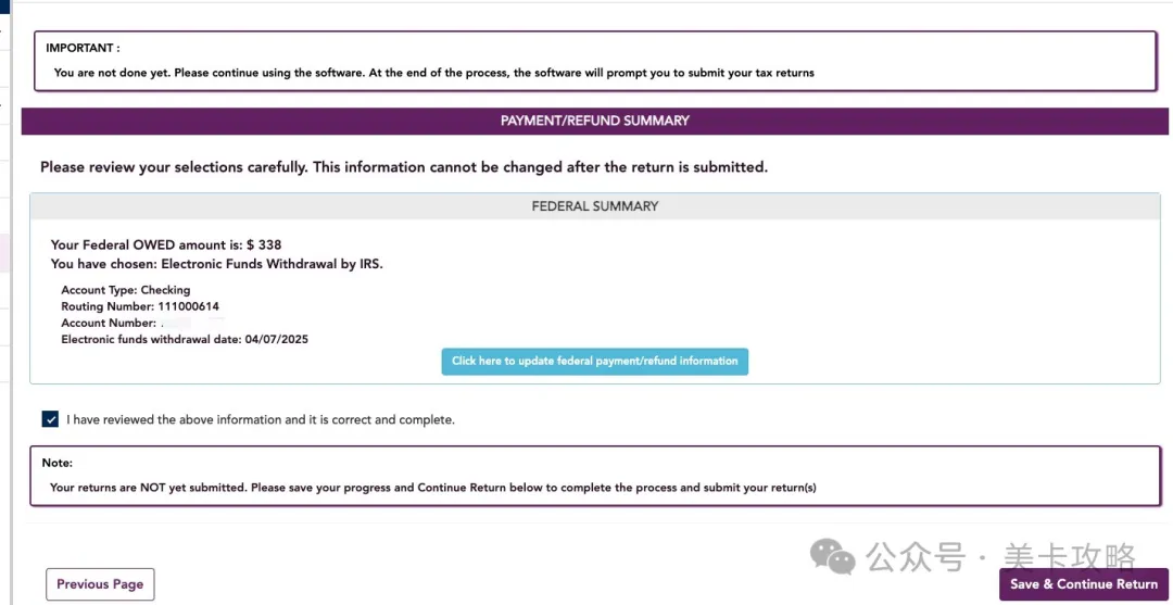 OLT做得比较好的一点是最终正式提交前,还会让你再审查一次基本信息(不包括地址)。包括支付方式,我这里例子选用的Chase ACH(再次建议:没有银行账户,请选择mail或在线支付,然后走pay1040或IRS官网支付,;如果选错了,请及时修改)