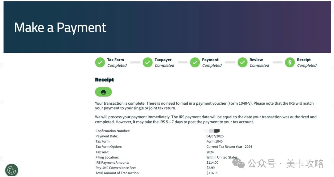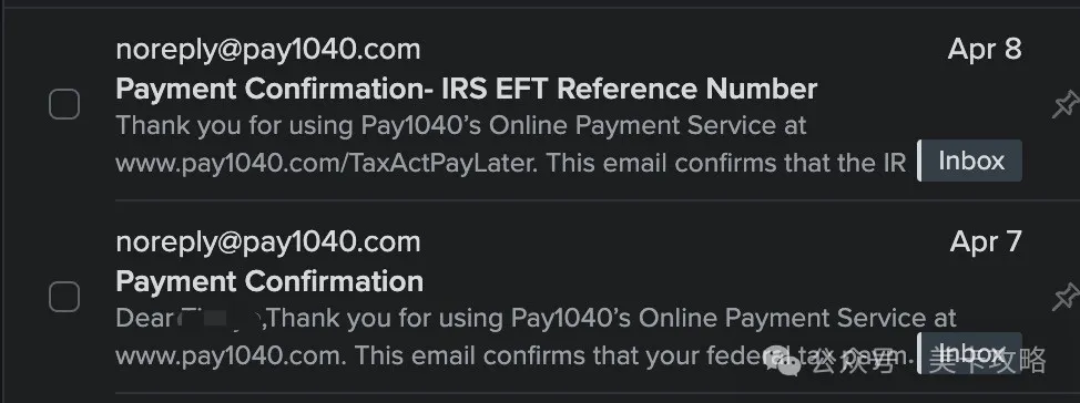 大概1-2天(最晚可能5-7个工作日),就会收到IRS的税款收到确认邮件(邮件标题:Payment Confirmation- IRS EFT Reference Number),我的情况是一天就搞定了,如下图。