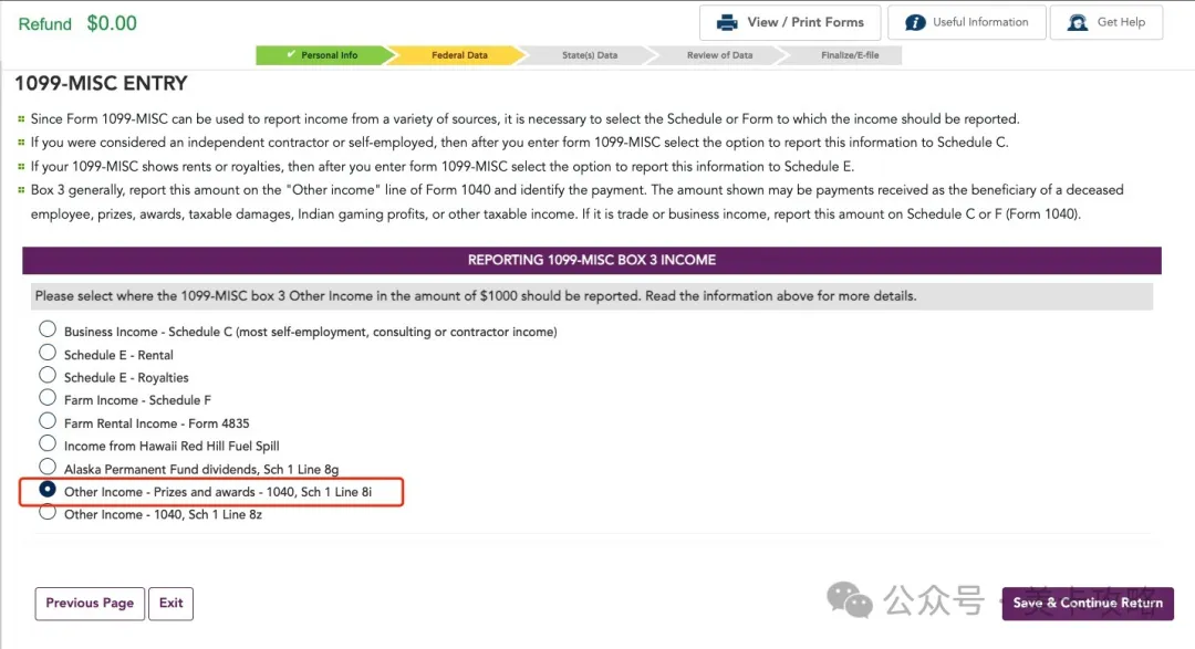 填好1099-MISC后,需要进行声明。我们一般都是银行的refer,所以选prizes and awards即可,这类缴税比例是10%。