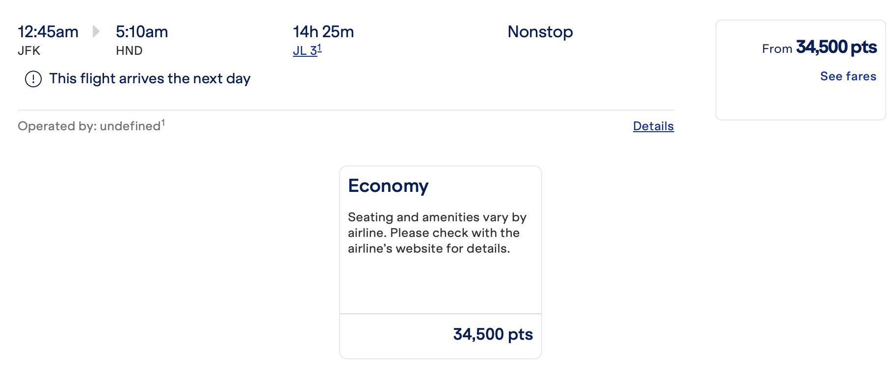 再来看美东,譬如 JFK-HND,单程经济舱、超经、商务所需里程是 34,500/59,000/79,900。