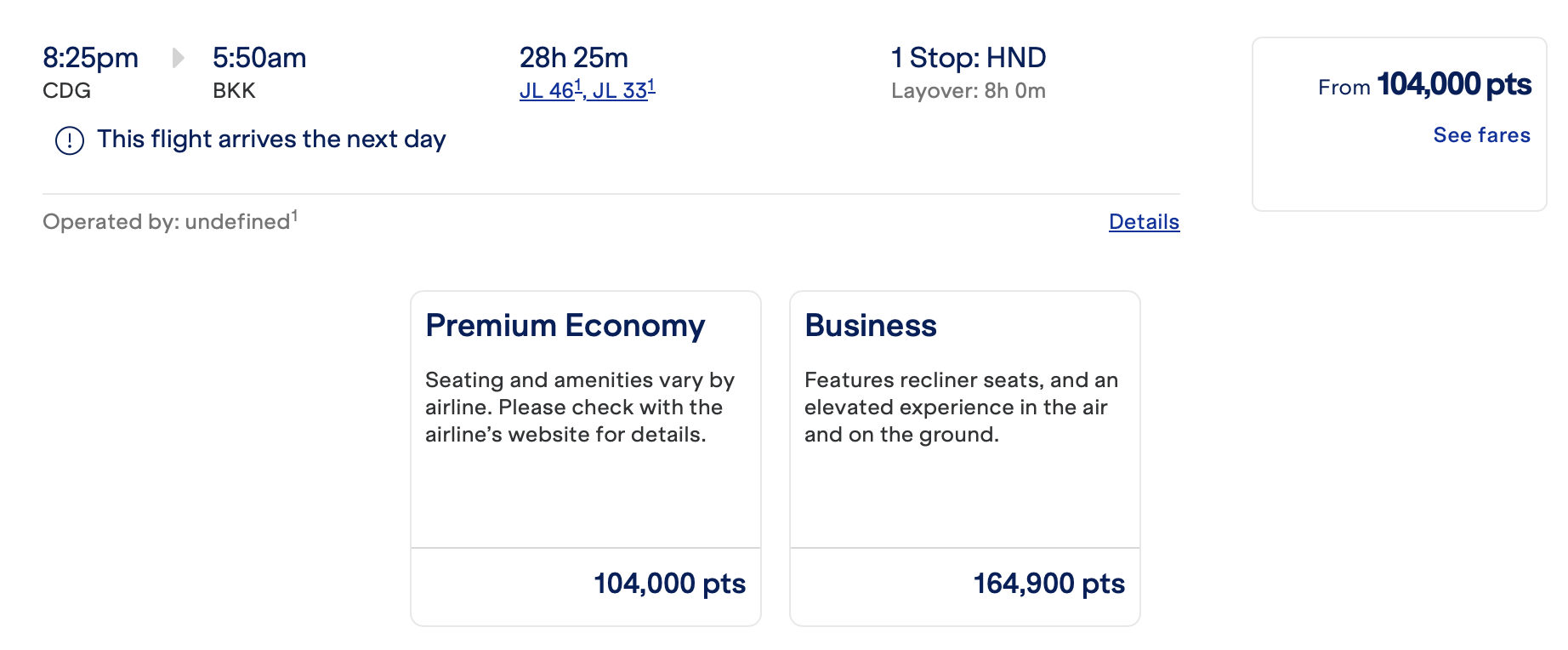 如果是欧洲飞到日本再飞到东南亚,其实就是两段加起来。后段(日本到东南亚,譬如 HND-BKK)单程所需里程是 24,400/45,000/85,000,总共路线(譬如 CDG-HND-BKK)的单程里程数是 59,900/104,000/164,900,但 YQ 会贵不少。完全不建议大家这么出,欧洲飞的话哪怕用 B6 去出票,也有很多其他的选择,譬如出卡塔尔或者 Etihad,里程票都很多。