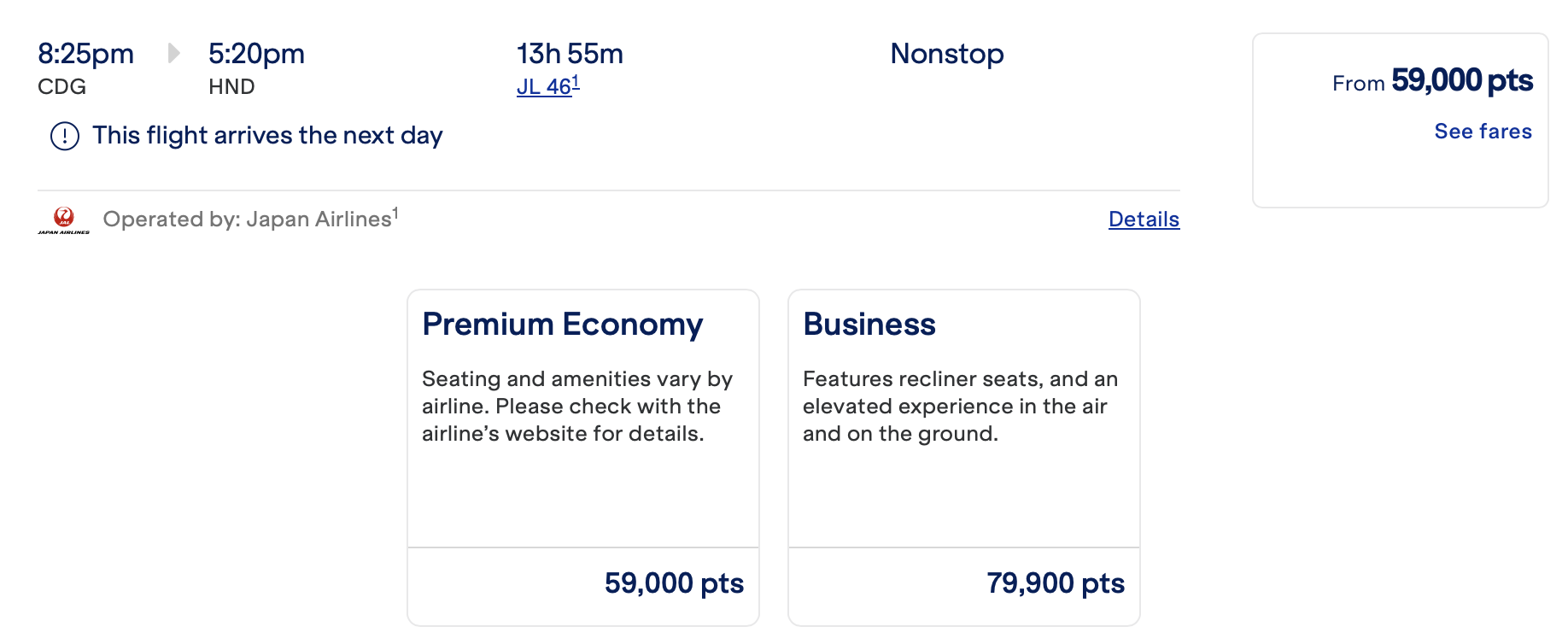 有趣的是,欧洲似乎也被划归到了美东里面。欧洲飞到日本,譬如 CDG-HND 路线,相应的里程数和美东完全相同,也是 34,500/59,000/79,900 里程。